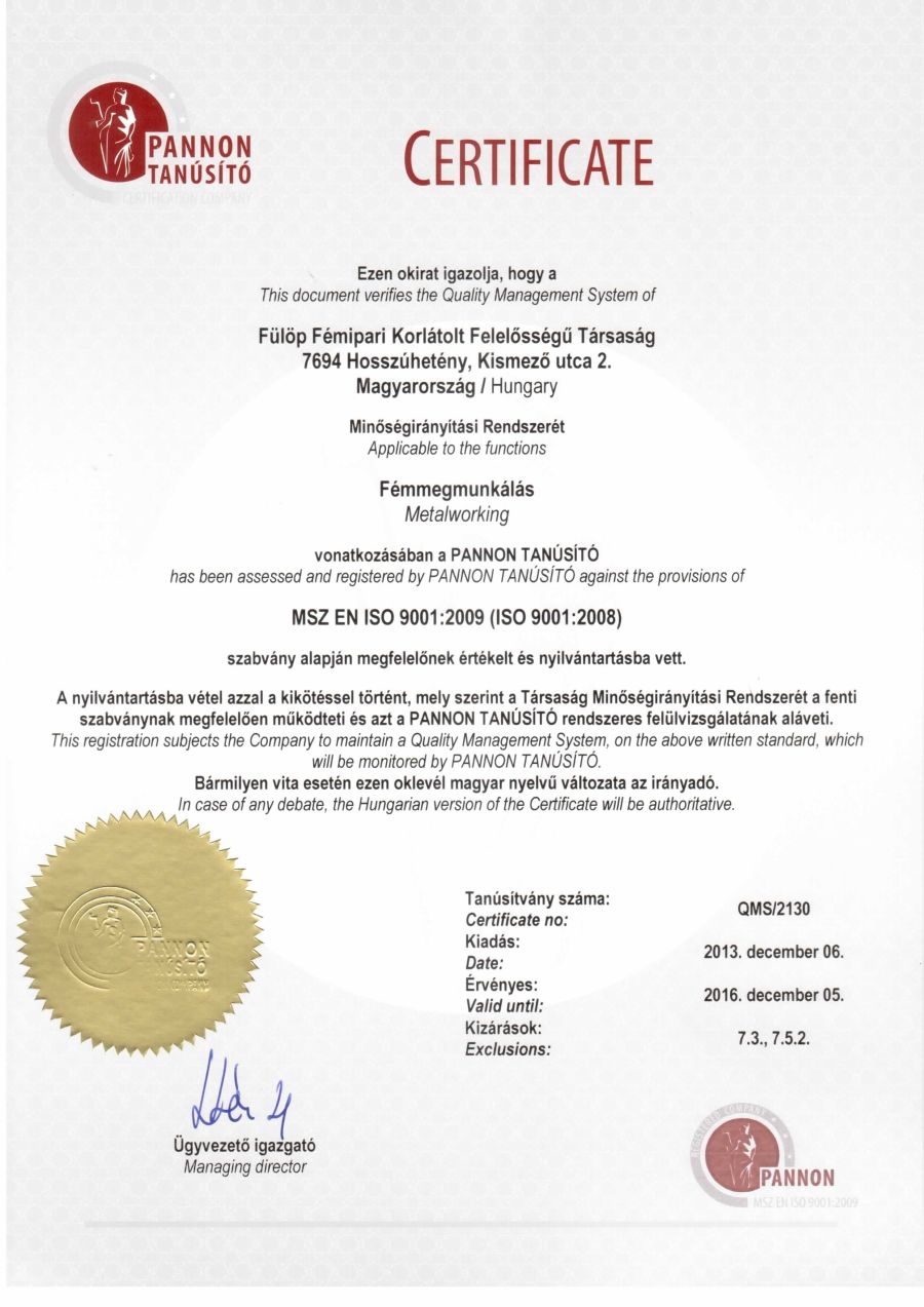 A Fülöp Fémipari Kft. 2005-ben alakult. Alapító tagok Fülöp Szabolcs és Soós Eszter. A műhely eleinte a cég székhelyén, Magyaregregyen volt, majd 2007 szeptemberével átkerült Hosszúheténybe, épület alapterülete 500 m2. Erre azért volt szükség, mert a növekvő megrendelések teljesítésére és a minőségi munkához nélkülözhetetlen folyamatos fejlesztésekre csak így volt lehetőség. Ez természetesen a géppark bővítését is maga után vonta, továbbá az alkalmazotti létszám is fokozatosan bővült. Jelenleg 11 fő dolgozik a cégnél. 2013-ban cégünknél bevezetésre került a MSZ EN ISO 9001:2009 minőségirányítási rendszer.